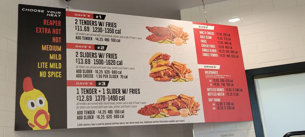 Sliders are served on a potato bun with kale slaw, pickles and drizzled with Dave's sauce & all tenders are served with sliced bread, pickles and a side of Dave's sauce.